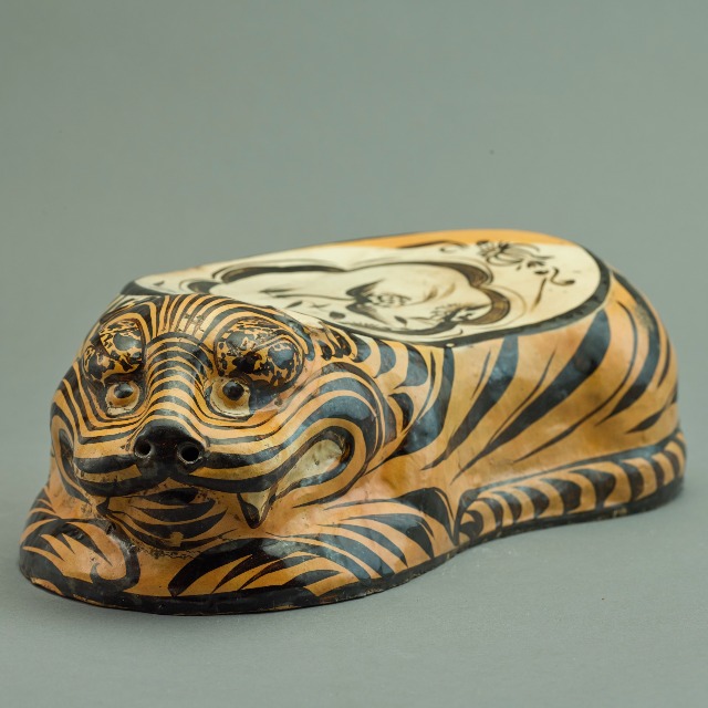 陶瓷虎枕是金代盛行的一种很有特色的生活用具,大致有白地和黄地两种,主要产地在山西、河南一带。从考古出土来看,它的使用范围集中于黄河流域。虎枕有着吉祥、辟邪的寓意,晋代葛洪的《肘后备急方》中就主张虎头枕可以治疗与睡眠相关的疾病。