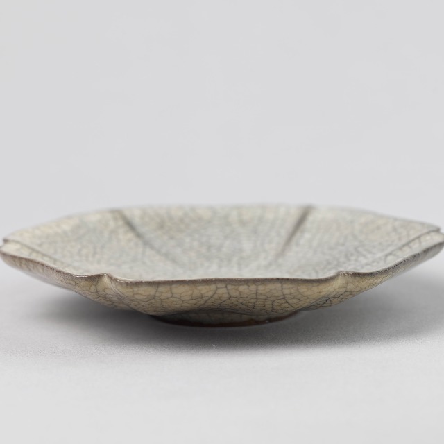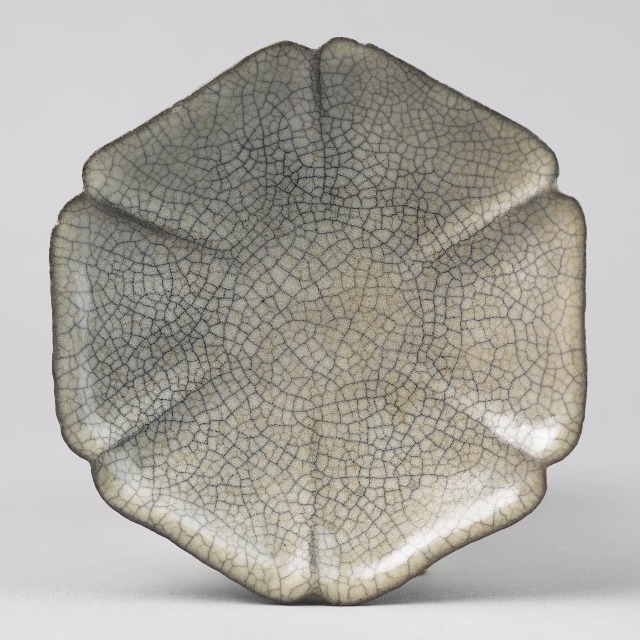盘呈六瓣葵花式,腹壁向内凸出六道棱线。敞口、浅弧壁、圈足。通体施青灰釉,釉色泛米黄,釉面开细碎片纹,可见明显的“金丝铁线”。足端无釉,呈红褐色。这类葵口盘还见有足部也为葵瓣式的,故宫博物院即藏有一例。