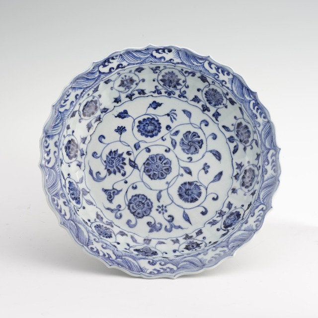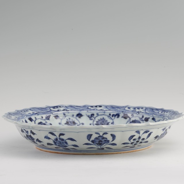 这类花口盘在明初官窑中颇为常见,型号有大有小。洪武时期花瓣状的器身立体,且花口密集。至永宣时,花瓣式的器身趋向圆滑,青花布局也更加舒朗。