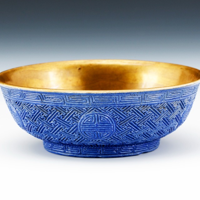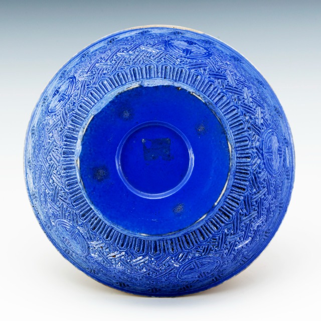 景德镇窑蓝釉剔雕团寿纹碗