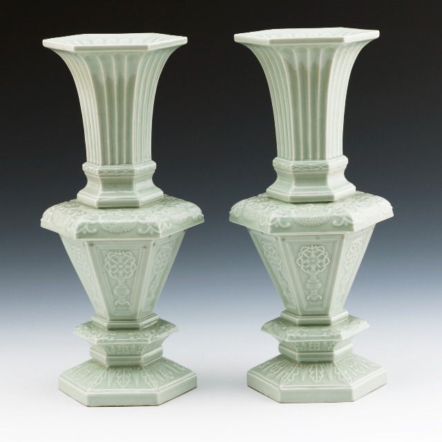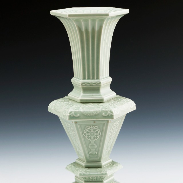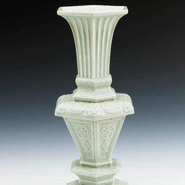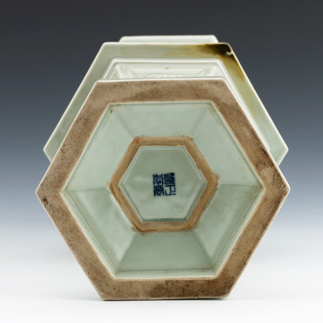 景德镇窑豆青釉印花六角形瓶