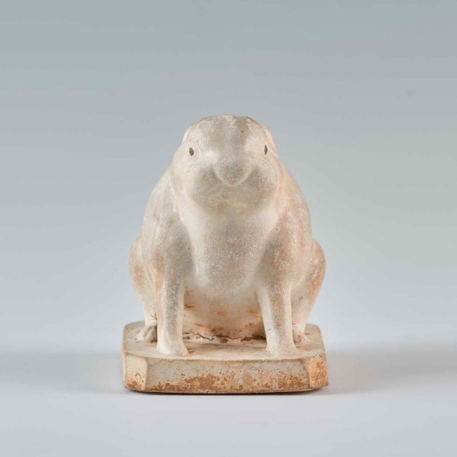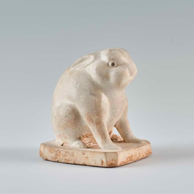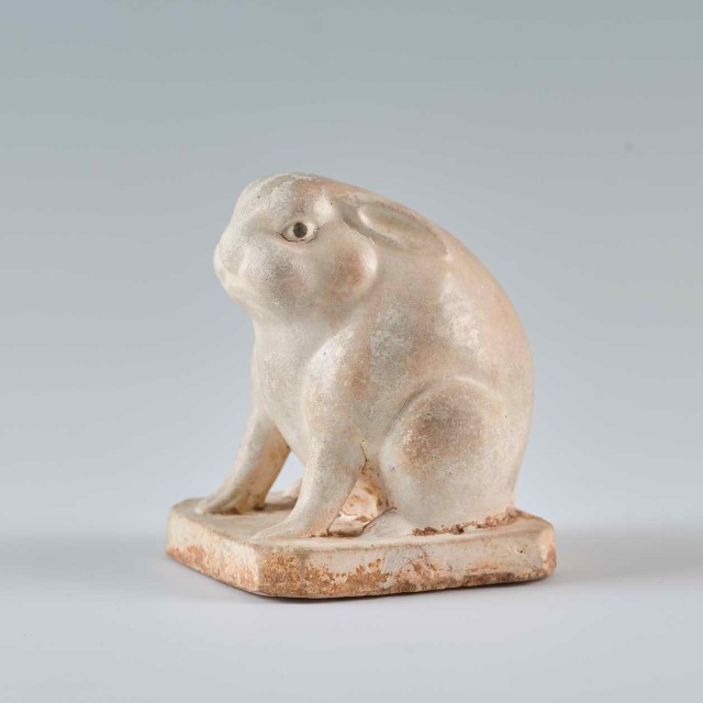 兔蹲踞于八边形台座之上,前肢挺于胸前,昂首前视,双耳后抿,贴于颈背。通体施白釉,台座底部露白胎微泛黄,兔眼点褐彩。巩义黄冶窑窑址曾出土造型相近的素胎残件,结合胎釉特征判断此件器物当属巩义窑产品。