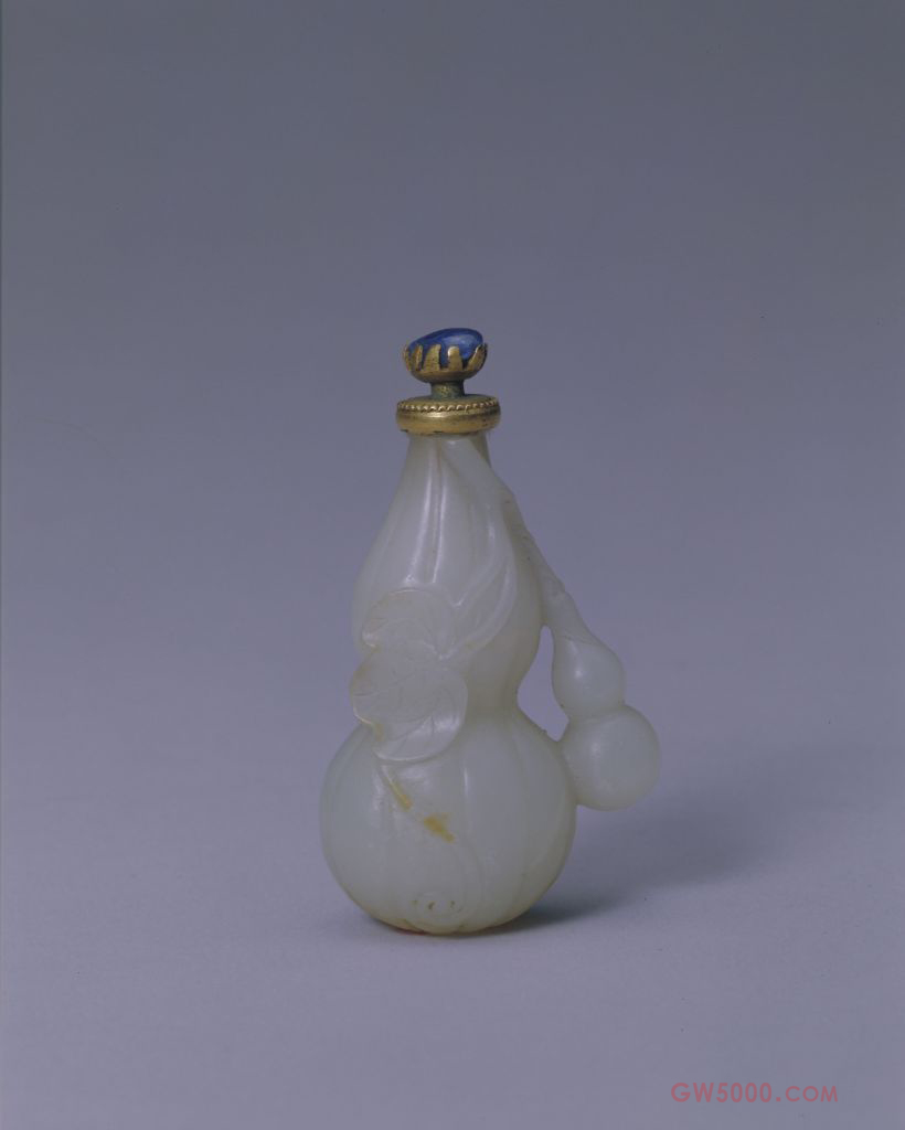 白玉葫芦式烟壶,清乾隆,通高5.5厘米,腹径3.2厘米。为笔头形状之一种。笔头尖部细长、腰部粗壮、状似葫芦的毛笔通常称为葫芦式。