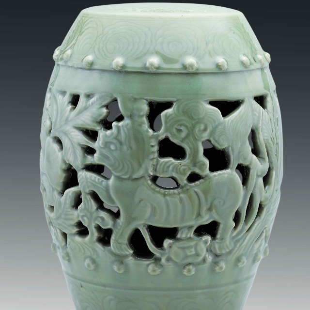 龙泉窑青釉镂空缠枝牡丹狮子纹鼓凳