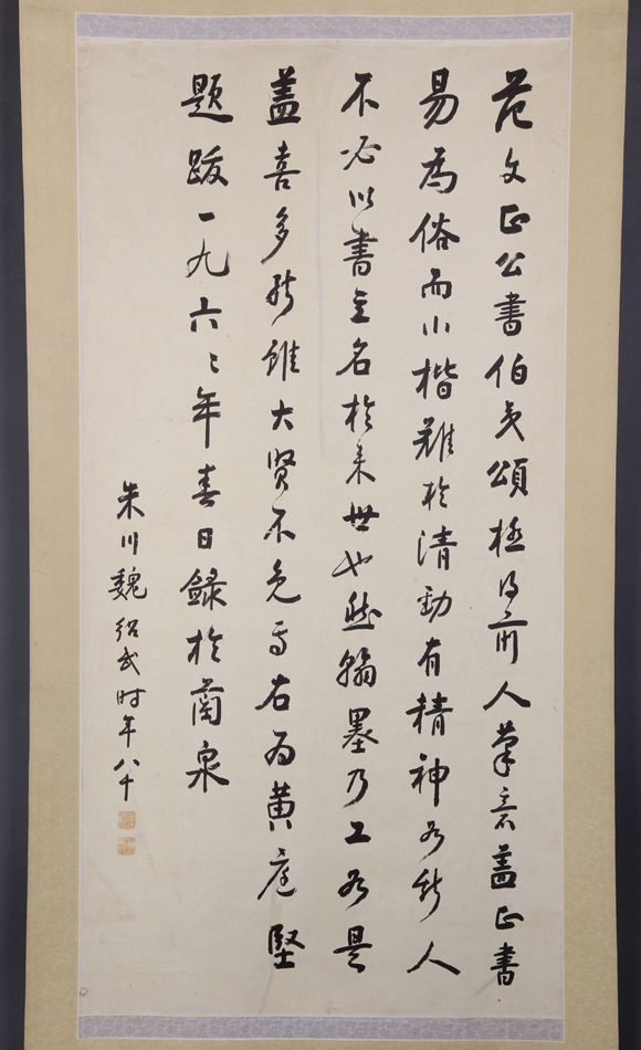 释文:范文正公书伯夷颂,极得前人笔意。盖正书易为俗,而小楷难于清劲有精神。如斯人,不必以书立名于来世也,然翰墨乃工如此。盖喜多能,虽大贤不免焉,右为黄庭坚题跋,一九六六年春日录于兰泉。