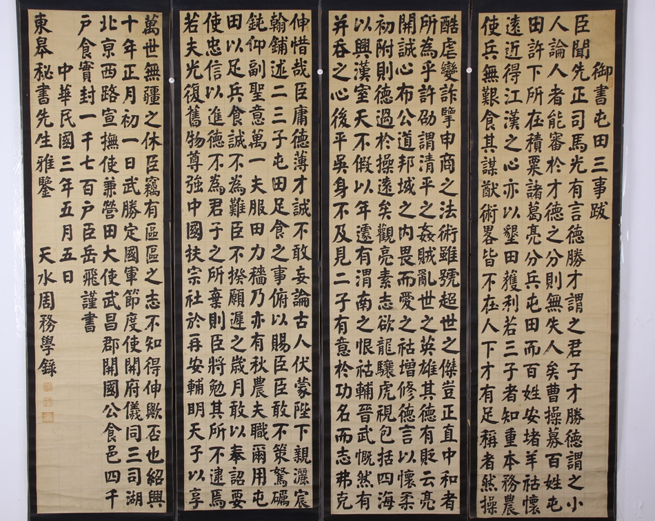 释文:(一)御书屯田三事跋臣闻先正司马光有言德胜才谓之君子才胜德谓之小人论人者能审于才德之分则无失人矣曹操募百姓屯田许下所在积粟诸葛亮分兵屯田而百姓安堵羊怙怀远近得江汉之心亦以垦田获利若三子者知重本务农使兵无艰食其谋猷术略皆不在人下才有足称者然操(二)酷虐变诈□申商之法术虽号超世之杰岂正直中和者所为乎许劭谓清平之奸贼乱世之英雄其德有贬云亮开诚心布公道邦域之内畏而爱之祜增修德言以怀柔初附则德过于操远矣观亮素志欲龙骧虎视包括四海以兴汉室天不假以年遽有渭南之恨祜辅晋武慨然有并吞之心后平吴身不及见二子有意于功名而志弗克(三)伸惜哉臣庸徳薄才诚不敢妄论古人伏蒙陛下亲洒宸翰铺述二三子屯田足食之事俯以赐臣臣敢不策驽砺钝仰副圣意万一夫服田力穑乃亦有秋农夫职尔用屯田以足兵食诚不为难臣不揆愿迟之岁月敢以奉诏要使忠信以进德不为君子之所弃则臣将勉其所不逮焉若夫光复旧物尊强中国扶宗社于再安辅明天子以享(四)万世无疆之休臣窃有区区之志不知得伸与否云绍兴十年正月初一日武胜定国军节度使开府仪同三司湖北京西路宣抚使兼营田大使武昌郡开国公食邑四千户食实封一千七百户臣岳飞谨书。