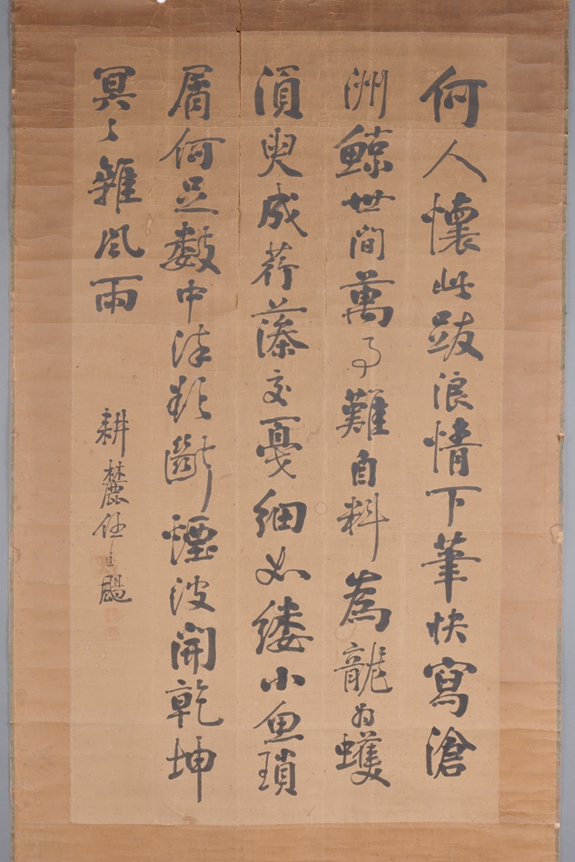 释文:何人怀此跋浪情下笔快写沧州鲸世间万事难自料为龙为蠖须臾成。荇藻交戛细如緌小鱼琐屑何足数中流欲断烟波开乾坤冥冥杂风雨。