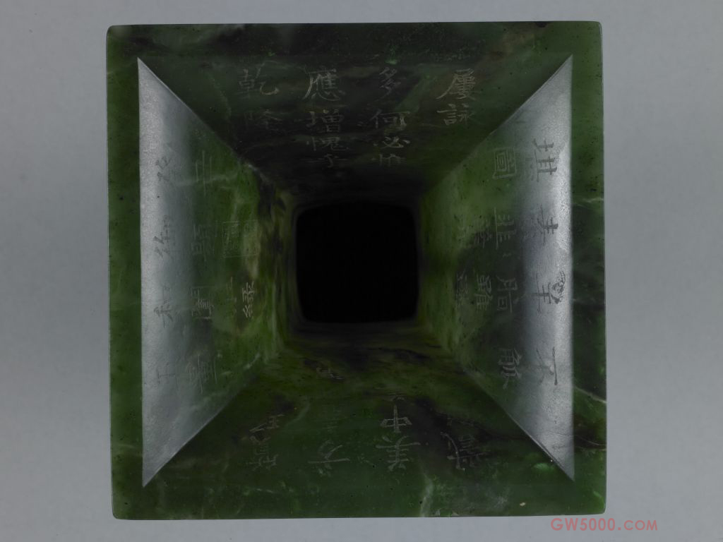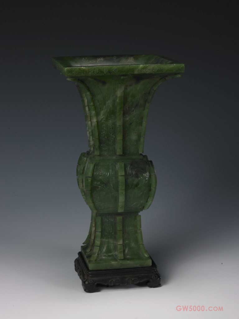 碧玉兽面纹方觚,清乾隆,高25.8厘米,宽14厘米。碧玉是新疆和阗软玉中的一个品种,软玉主要有白玉、青玉、碧玉、墨玉、黄玉等品种。其中碧玉色如菠菜叶,略有透明感,呈油脂或蜡状光泽。由于所含成分不同,颜色和结构均不如其它软玉均一,色彩淡的呈菜色,色彩深的呈墨绿色,还有斑杂的大环斑状。兽面是古代人们想象中的怪兽的面部,将其刻画在器物上所形成的纹饰称兽面纹。宋代的学者把兽面纹称为饕餮纹。