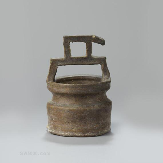 酱釉,井体呈圆筒形,口沿翻折,方圆唇,上部内凹,平底,上装镂空井架。俑立在井旁,头戴鲜卑垂裙帽,身穿交领窄袖长襦,上身前倾,双手交叉胸前,向井内探看。