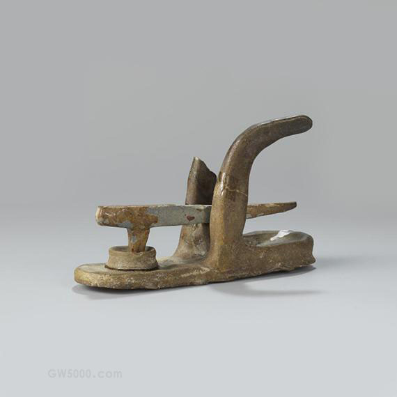 酱釉,碓为分体式,臼盘呈圆形,杵置于附架上,方便起落。俑立在碓前,头戴鲜卑垂裙帽,身穿交领窄袖长襦,上身稍前倾,右手扶在碓架杆之上,右脚前伸踏杵。