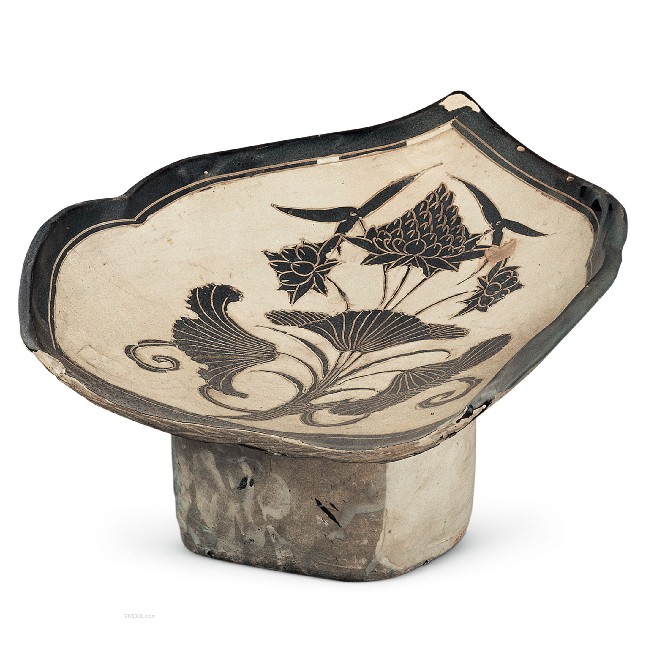 枕面呈如意形,装饰采用剔花工艺,在白色化妆土上先盖一