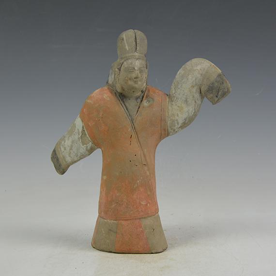 泥质灰陶,头戴垂裙皂帽,面目圆润,五官清秀,耳有饰物,内着白色长褥,外披一件红色左祍半臂,长裙曳地。左手在钱,将长袖舒展扬起,右手在后,将长袖尽情甩开,神态愉悦自然。