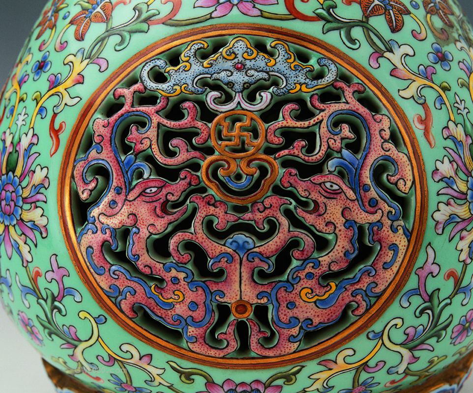 瓶体由外瓶、内瓶、底座分别烧造组成,外瓶套于内瓶外,内瓶与底座有轴碗相连,它是根据陶车旋转原理而制。通体色地饰粉彩,主体绘夔龙纹,辅以番莲纹、云纹等。外底松石绿釉上书红彩“大清乾隆年制”篆书款。清代景德镇瓷业于乾隆年间达到鼎峰,粉彩转心瓶为乾隆时期的佼佼者。该器外瓶精工镂雕,制作复杂,施彩浓艳,构图繁密,巧夺天工。