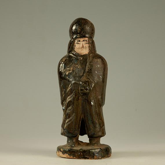 戴风帽,穿披风,拱手站立。手中有圆孔,原执物失落。风帽、披风绘白色斜条纹。