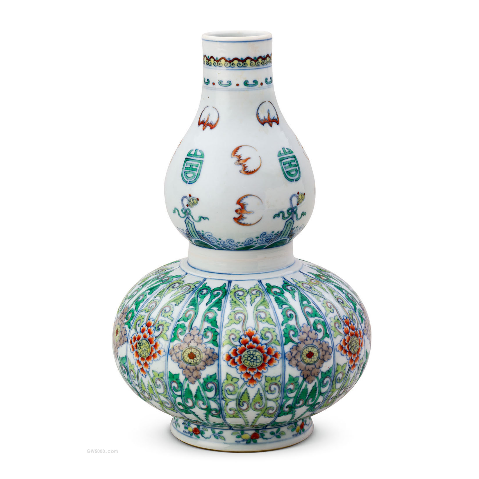 瓶呈葫芦形。外壁斗彩绘番莲、五蝠捧寿和寿山福海等纹饰。外底青花书“大清雍正年制”双圈楷书款。五福捧寿图为典型吉祥纹样,流行于清代。《尚书·洪范》称五福:“一日寿,二日富,三曰康宁,四曰攸好德,五曰考终命。”民间把“五福”释为福、禄、寿、喜、财,有所谓“人臻五福,花满三春”之说。雍正斗彩器制作工艺精湛,青花色调明快,粉彩淡雅柔丽,两者相辅相成。此瓶别致的造型与清新典雅的图案完美地结合在一起,极富艺术效果,为斗彩瓷中精品。