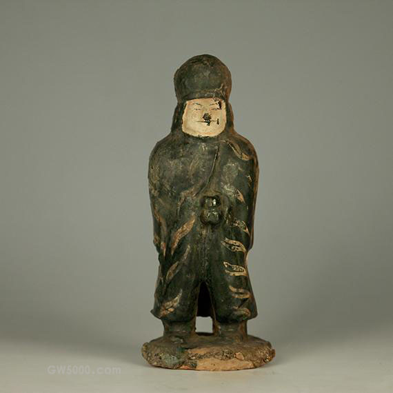 戴风帽,穿披风,拱手站立。手中有圆孔,原执物失落。风帽、披风绘白色斜条纹。