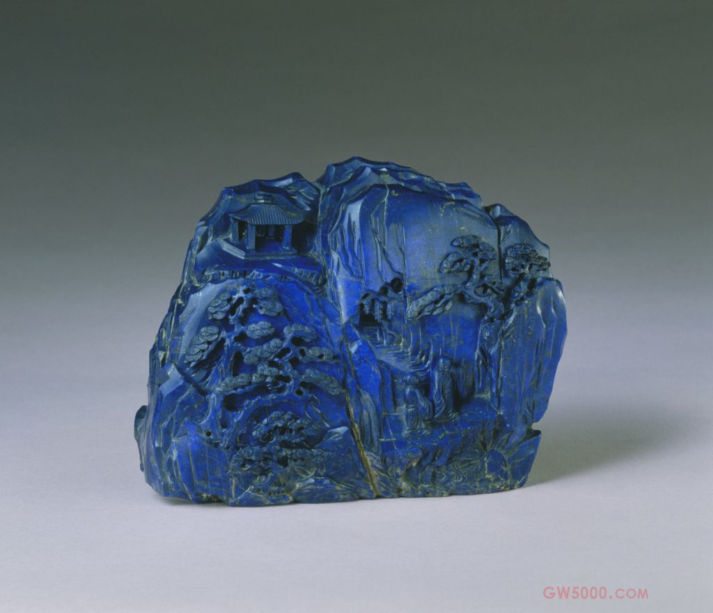 清代宫廷制作的山形景观极多,但青金石的作品很少,特别是如此大块的原石,选料优良,色蓝如靛,不杂白石,雕刻精致,是清代乾隆时极其珍贵的代表作品。