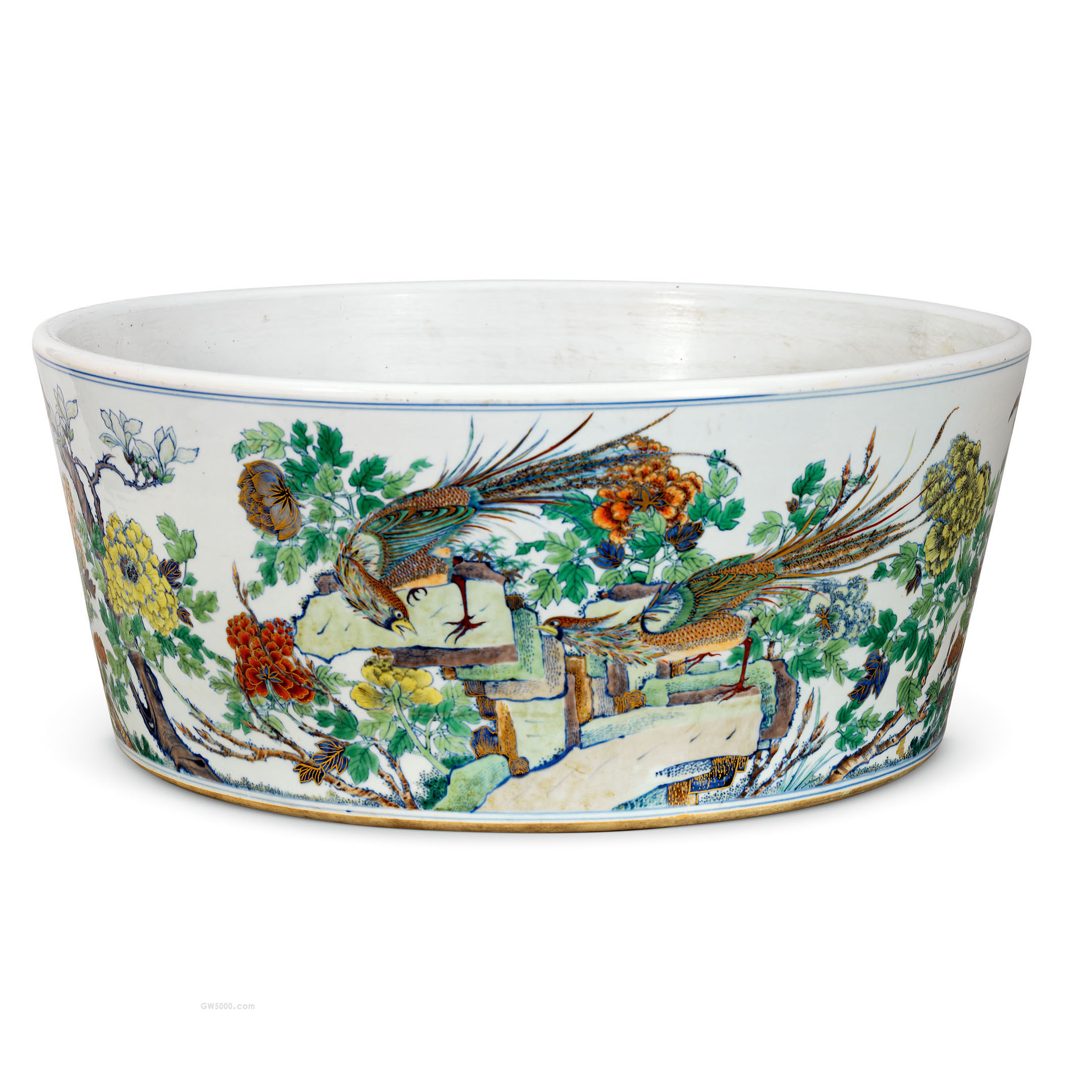 敞口,斜直腹,宽平底。图案绘制精湛,设色鲜丽,画面清晰明快,鲜花怒放,枝繁叶茂,表现出姹紫嫣红、春意盎然的景致。外壁所饰牡丹花色不一,有红、黄、绿等色,花朵皆出犄,俗称“出犄牡丹”,为康熙瓷器上牡丹的典型画法。吉祥图案是陶瓷装饰的主要内容,清代瓷绘更是“图必有意,意必吉祥”。玉兰、海棠与牡丹,三花相拥,寓意“玉堂富贵”。清康熙时期的瓷缸式样之多,尺寸之大,制作之精,不逊于明嘉靖、万历时期,此器虽胎体厚重,但器型端庄规整,为康熙时期罕见之作。