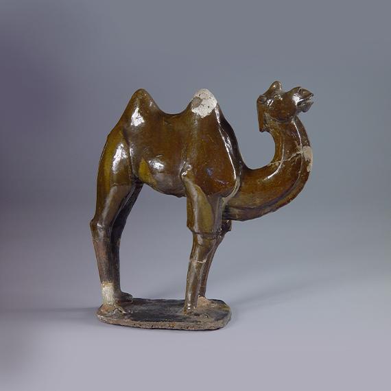陶质,骆驼通体施黑釉,呈站立状,昂首曲颈,颈部弯弧而长,双耳竖立,目视前方,鼻孔翕张,张嘴嘶鸣。双峰高耸,细尾顺垂,脚掌宽大,体态健壮,造型生动逼真,是不可多得的精品。