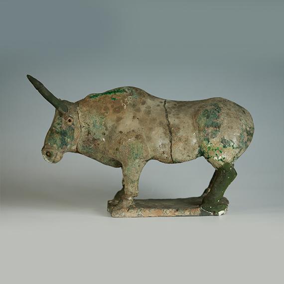 灰陶质,全身涂白绿彩。牛蹄正中阴刻分瓣,长方形底座。牛躯体浑圆强壮、笼套俱全,神情憨厚、塑形准确。