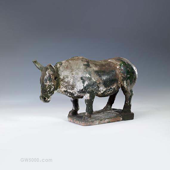 灰陶质,全身涂白彩。牛蹄正中阴刻分瓣,长方形底座。牛躯体浑圆强壮、笼套俱全,神情憨厚、塑形准确。