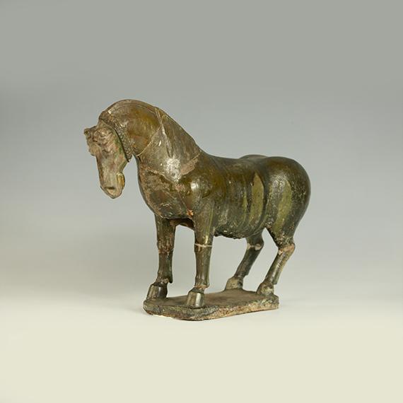 马通体施青绿色釉。马首微低内勾,目视下方,头顶部的鬃毛以马耳为中心围绕盘起并以丝带约束。颈部长鬃下披,臀肥体壮,四肢健美有力,表情温驯,写实性强。