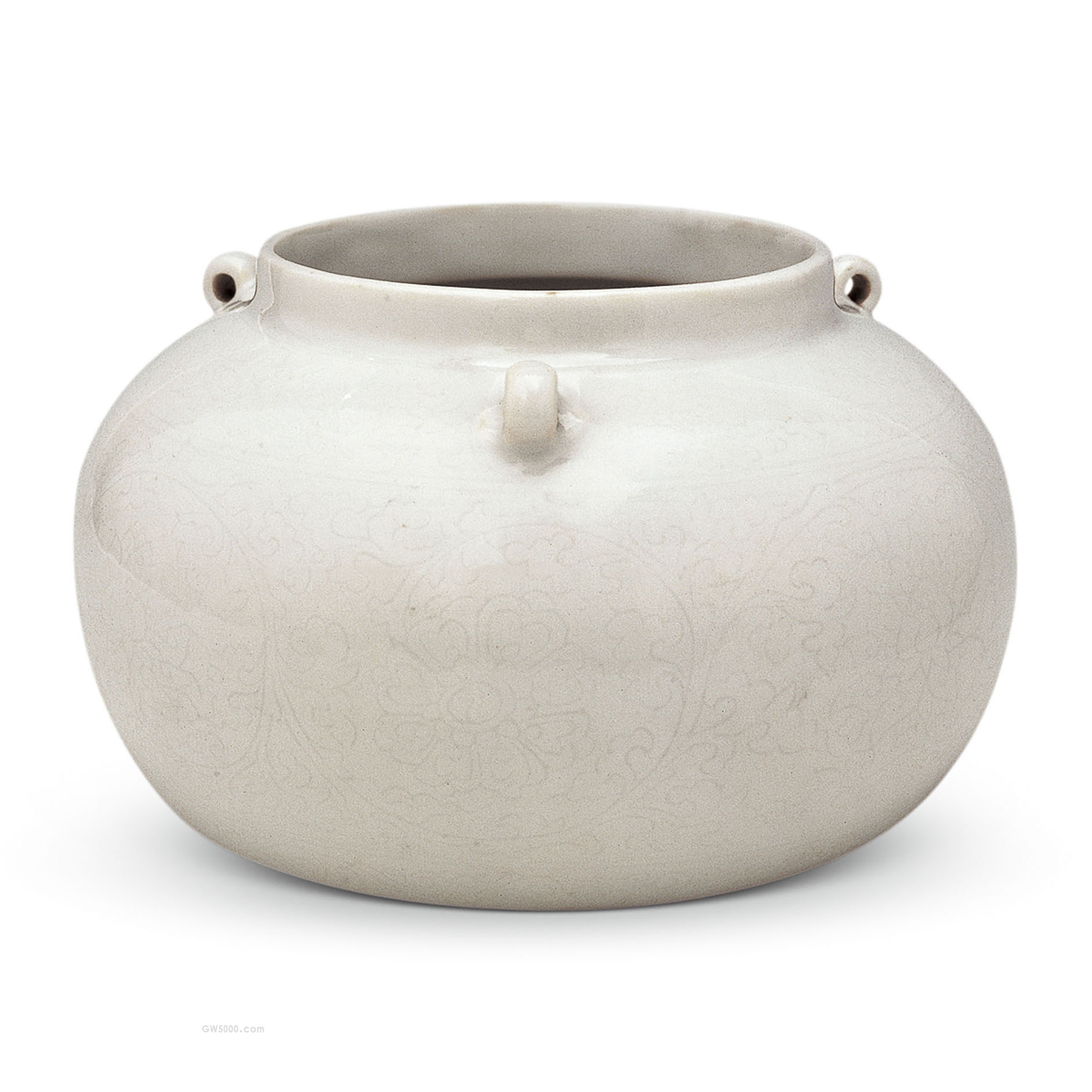 直口,短颈,肩附三系,扁圆腹,平底。甜白釉莹润