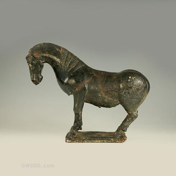 马通体施青绿色釉。马首微低内勾,目视下方,头顶部的鬃毛以马耳为中心围绕盘起并以丝带约束。颈部长鬃下披,臀肥体壮,四肢健美有力,表情温驯,写实性强。