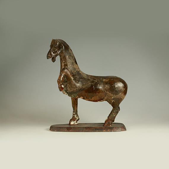 马呈站立状,昂首张嘴,左前蹄抬起。