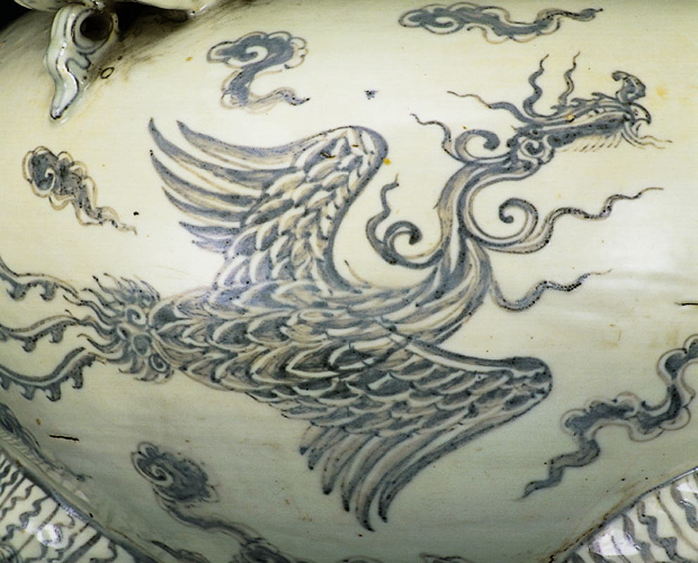 凤纹,苍龙遒劲,飞凤轻盈,周围祥云萦绕,寓意吉祥幸福。