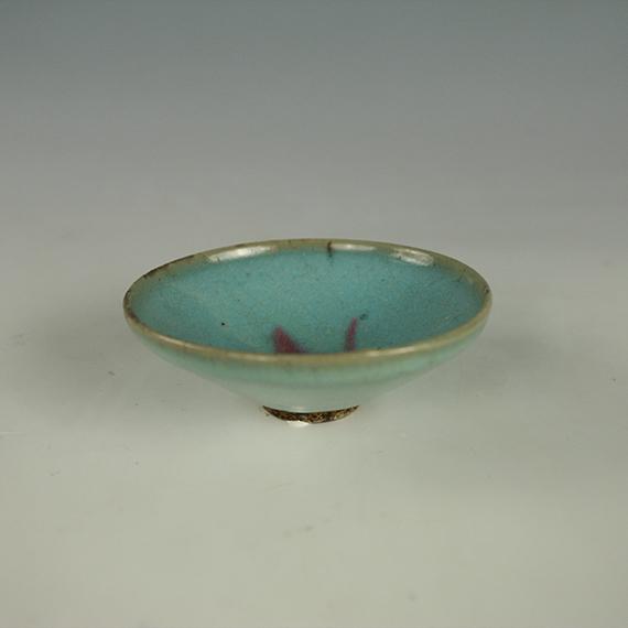敛口,弧壁内收,深腹,圈足。釉呈天蓝色,釉面布鬃眼且伴有开片纹,外壁底有垂釉现象。内外壁满釉,外壁施釉不及底,圈足处无釉。