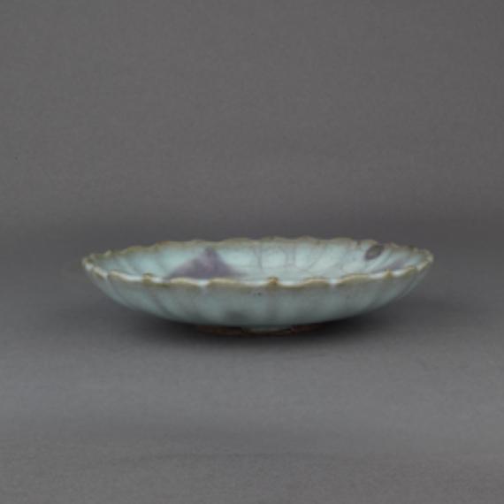 口沿呈花瓣形,弧壁浅腹,腹壁内外均凸现与之相对应的莲瓣棱,小圈足。釉呈天蓝色,釉面布鬃眼且伴有开片纹,器口及莲瓣棱处釉薄呈黄色,外壁底有垂釉现象。内外壁满釉,外壁施釉不及底,圈足处无釉。