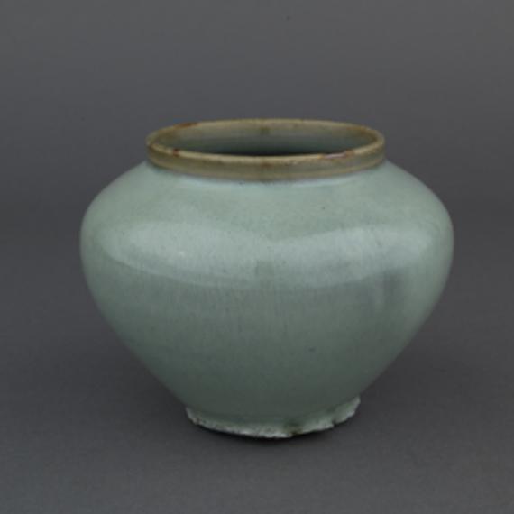 豆青瓷罐。圆口,圆腹,平底,圈足,胎质,釉色细腻,表里施浅豆青色釉,釉层较厚,口沿呈黄色。罐口有莲瓣纹盖,釉面有细碎冰裂纹,釉色豆青,其中绿的成分较大。此盖不似原物,可能是后配的。
