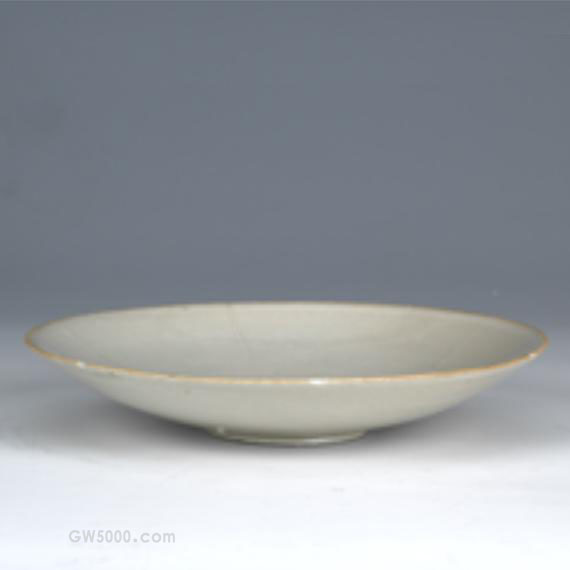白瓷碟。十二瓣花口,芒口,圈足。内壁腹、底交接处有凹弦纹一道,每个口沿豁口处向下至近弦纹处有凸棱一道,内底画莲花朵,并以植物枝叶图案陪衬。花瓣一侧或两侧画双线,或用刀剔出轮廓,或在花纹一侧用刀剔过。器物内底所画莲花纹不完全相同,说明是工匠的随意之作。