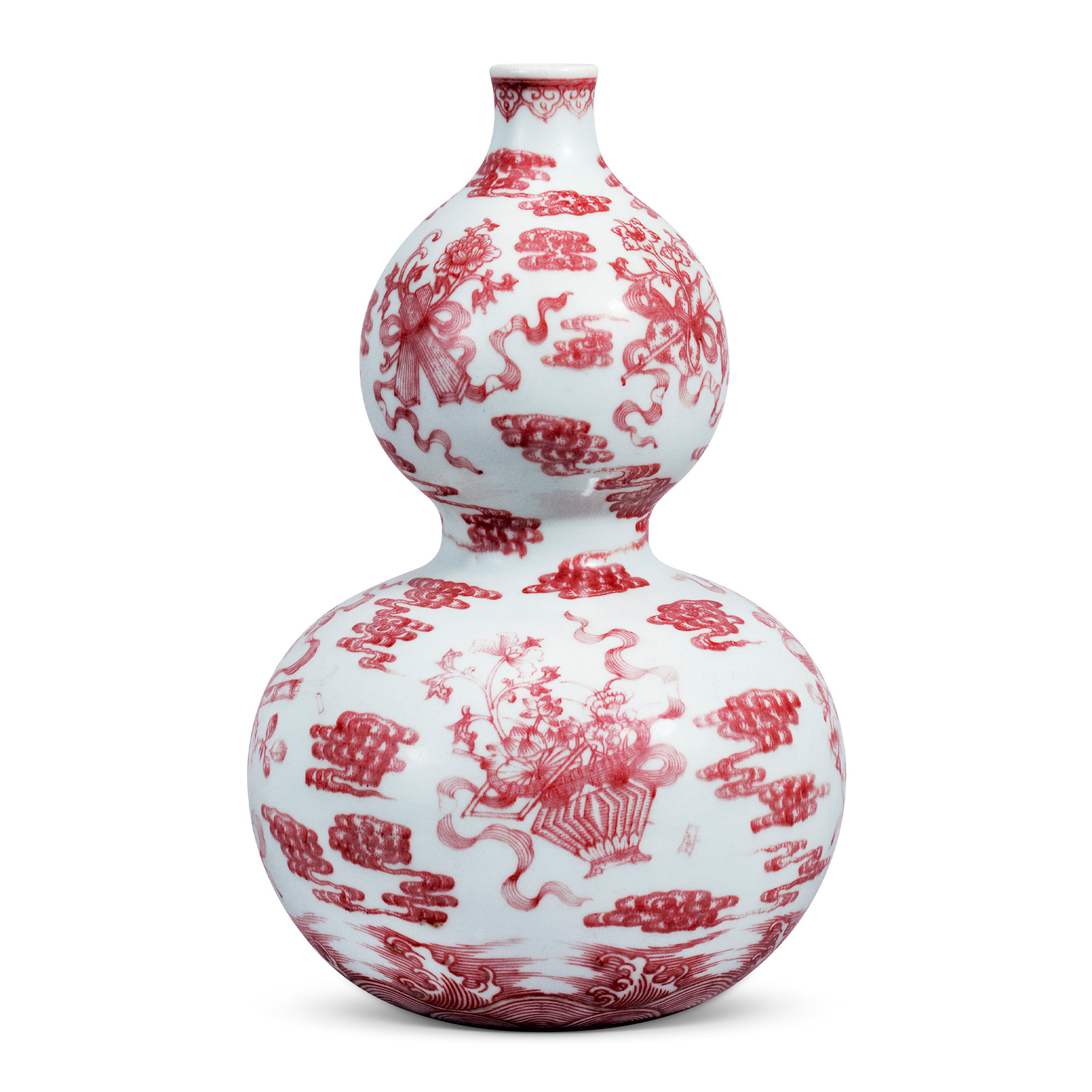 器呈葫芦造型,上下腹以釉里红绘暗八仙纹,间以祥云朵朵, 口沿及近足则分饰如意头纹及海水江崖纹。此器釉色肥润,釉里红发色典雅,纹饰笔触织细,堪称乾隆釉里红品种的经典之作。底书青花