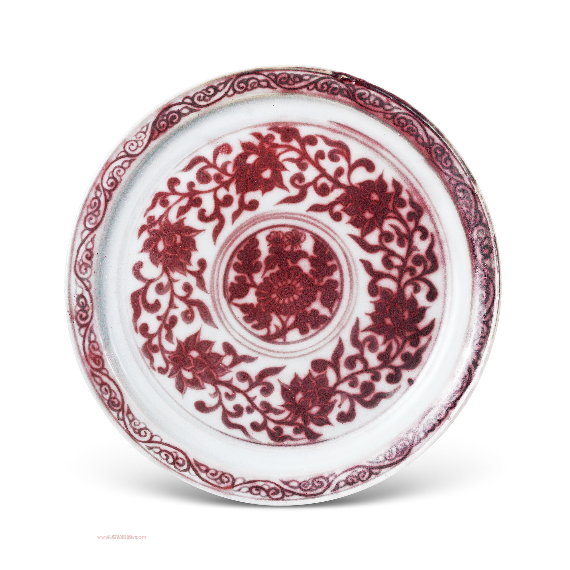 折沿,弧壁,浅腹,圈足。器内底凸棱一周,可置杯盏。通体釉 里红纹饰,外壁为莲瓣纹,内口沿为卷草纹,盘心绘折枝菊花纹,外围绘缠枝莲纹。外底无釉,露胎火石红色。此器铜红釉发色纯正,为洪武釉里红的典型器物。