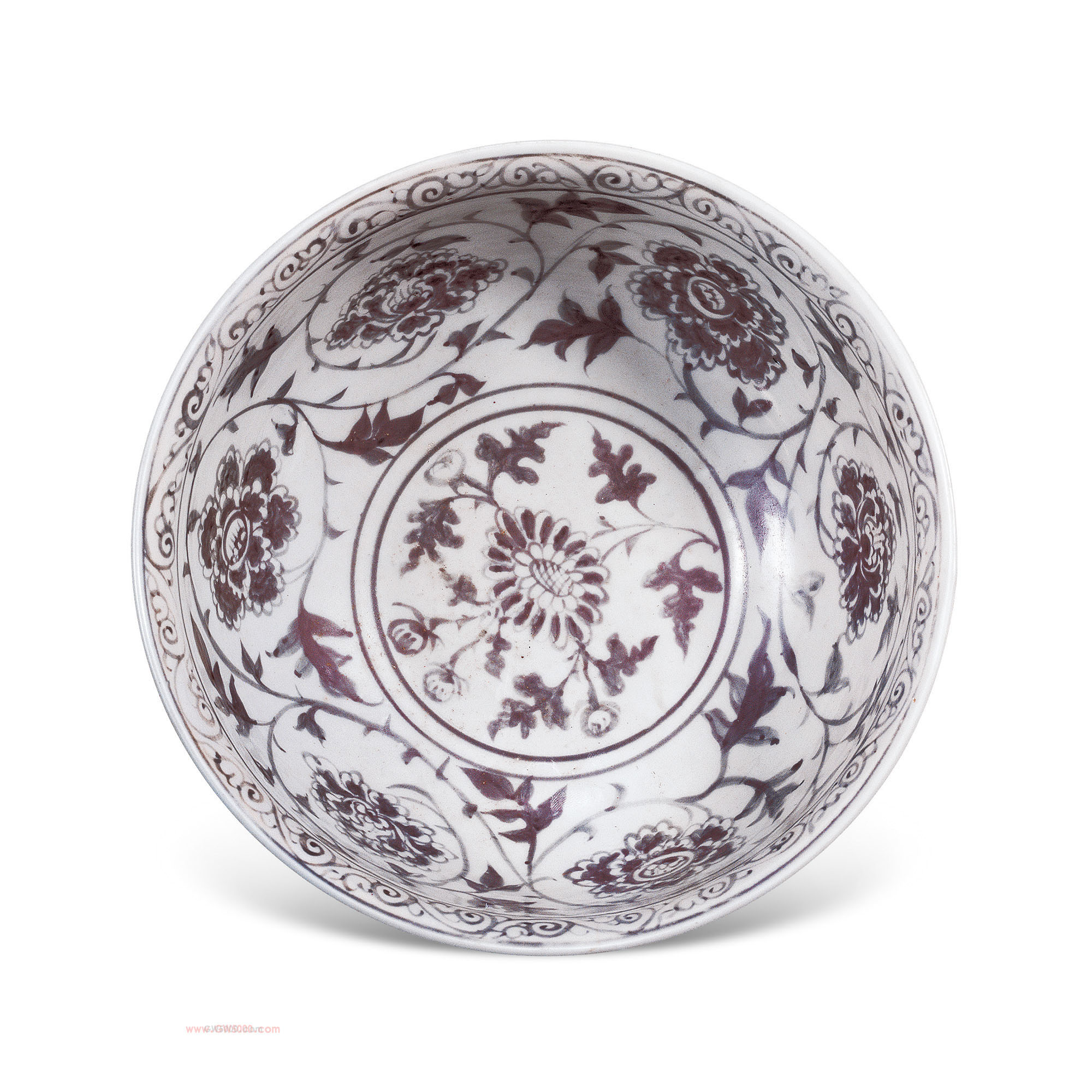 敞口,深腹,平底。通体以釉里红作装饰,内口沿绘忍冬纹, 外口沿及足墙均绘回纹。内壁绘缠枝牡丹花,碗心绘菊纹,外壁绘缠枝菊。