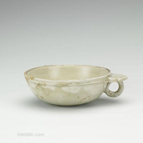 单柄洗。芒口,口沿外敞,器身似钵。口沿比器腹略厚,凹圈足,环形柄,柄上有鑿,大体呈三角形,边缘呈花瓣状,上有凹纹2圈。内底饰莲花纹,属划花。花一侧画双线,轮廓都曾用刀剔过,周以凹弦纹。白釉,白胎,釉层薄厚不匀,有冰裂纹。