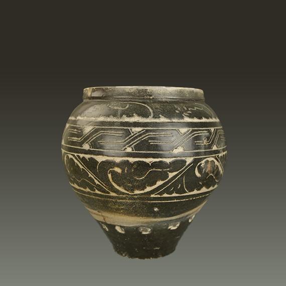该罐器型硕大,直口,肩高耸,平底。器身通体剔花卉纹、几何纹等。通体施酱釉,下腹部有一周排列有序的乳钉纹。