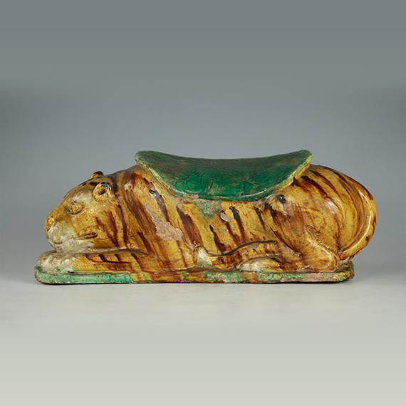 红胎。枕体呈卧虎状,虎卧于长方形垫板之上,虎尾盘至腹部,前爪匍伏,虎头垫于其上,面相温顺。虎背伏一荷叶形枕面,其上划荷花纹,施绿釉。身施黄釉,之上绘褐色斑纹,枕背面贴塑树木山石,俨然一猛虎悠闲卧于山林之中,给人以亲近之感。