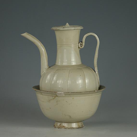 注壶通体施白釉。壶口微敞,圆鼓腹,腹部压十条瓜棱,长弧颈,曲流,矮圈足。相对流贴塑如意耳形壶柄。壶盖中部下凹,中央凸出花形钮,外沿向下弧曲,与壶口吻合。注碗口沿外撇,作六出花瓣形,碗壁压六条瓜棱纹至碗底,圈足外撇。胎质洁白细腻,壶通体、碗内壁施透明釉,积釉处泛青黄色。