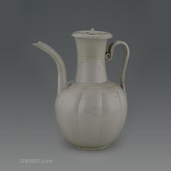 注壶通体施白釉。壶口微敞,圆鼓腹,腹部压十条瓜棱,长弧颈,曲流,矮圈足。相对流贴塑如意耳形壶柄。壶盖中部下凹,中央凸出花形钮,外沿向下弧曲,与壶口吻合。质洁白细腻,壶通体施透明釉,积釉处泛青黄色。