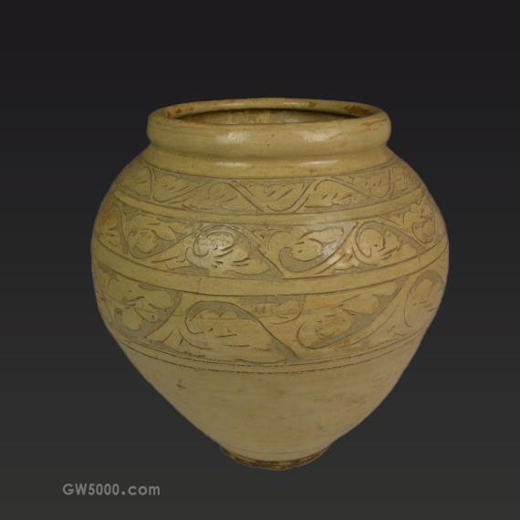 圆唇内卷,圆肩,鼓腹下收,平底。肩和上腹部剔刻三层连续花草纹,间饰一弦纹带。灰白胎,通体施白釉,釉层光亮。