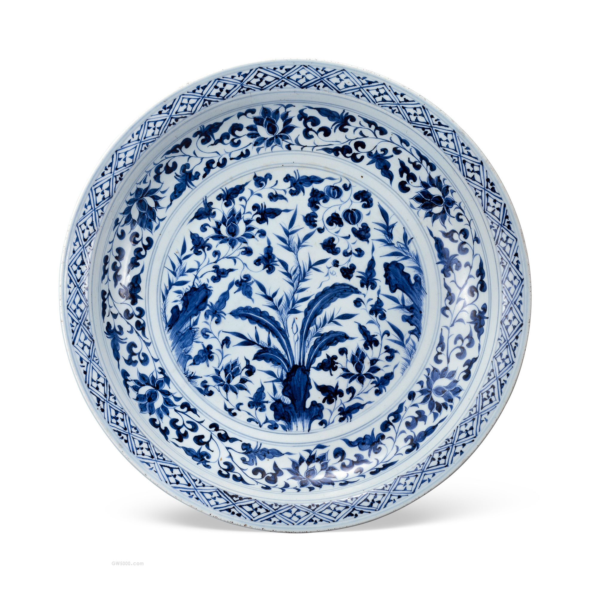 折沿,弧腹,平底。口沿饰冰凌花纹,内墙饰缠枝莲纹,内底饰竹石芭蕉纹,青花发色浓艳,为典型元代特征。