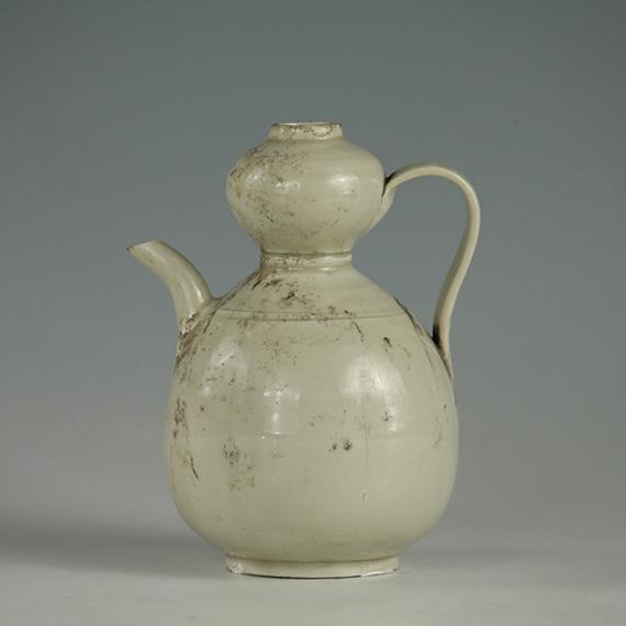 胎质洁白,器形呈葫芦形,缺盖,小口,肩置短流,侧附曲柄,圈足,肩腹部有两周弦纹。呈葫芦形,小直口,鼓腹,圈足。腹部置短流及扁形曲柄,肩饰两道弦纹。通体施白釉,釉色白中泛青。