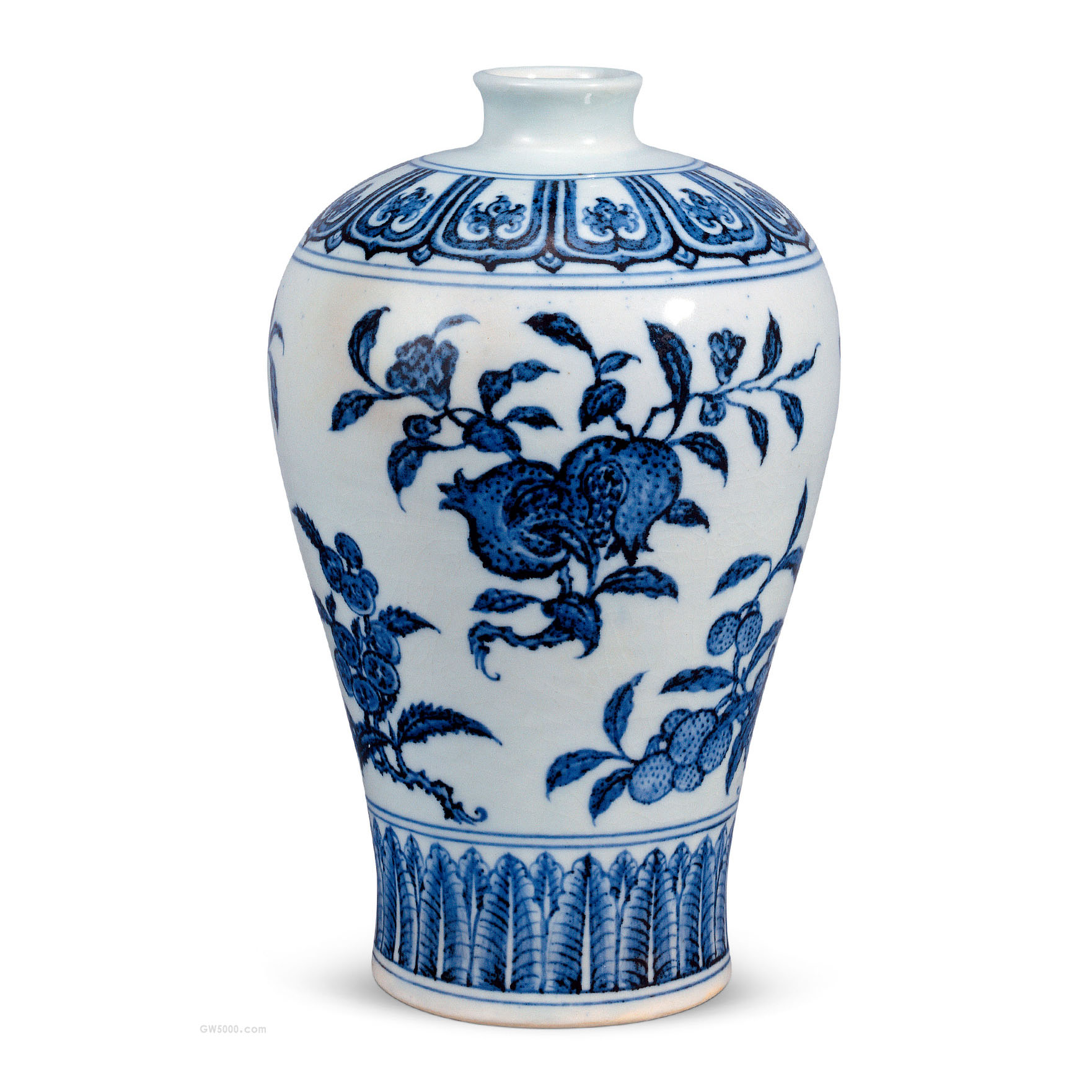卷唇,直口,溜肩,平底。颈部素纹,肩部饰莲瓣纹一周,器身 饰福寿三多折枝花果图,近足饰叠叶芭蕉纹。器形规整硕大,青料用苏麻离青,发色浓艳,光彩夺目,为永乐青花大器之精品。