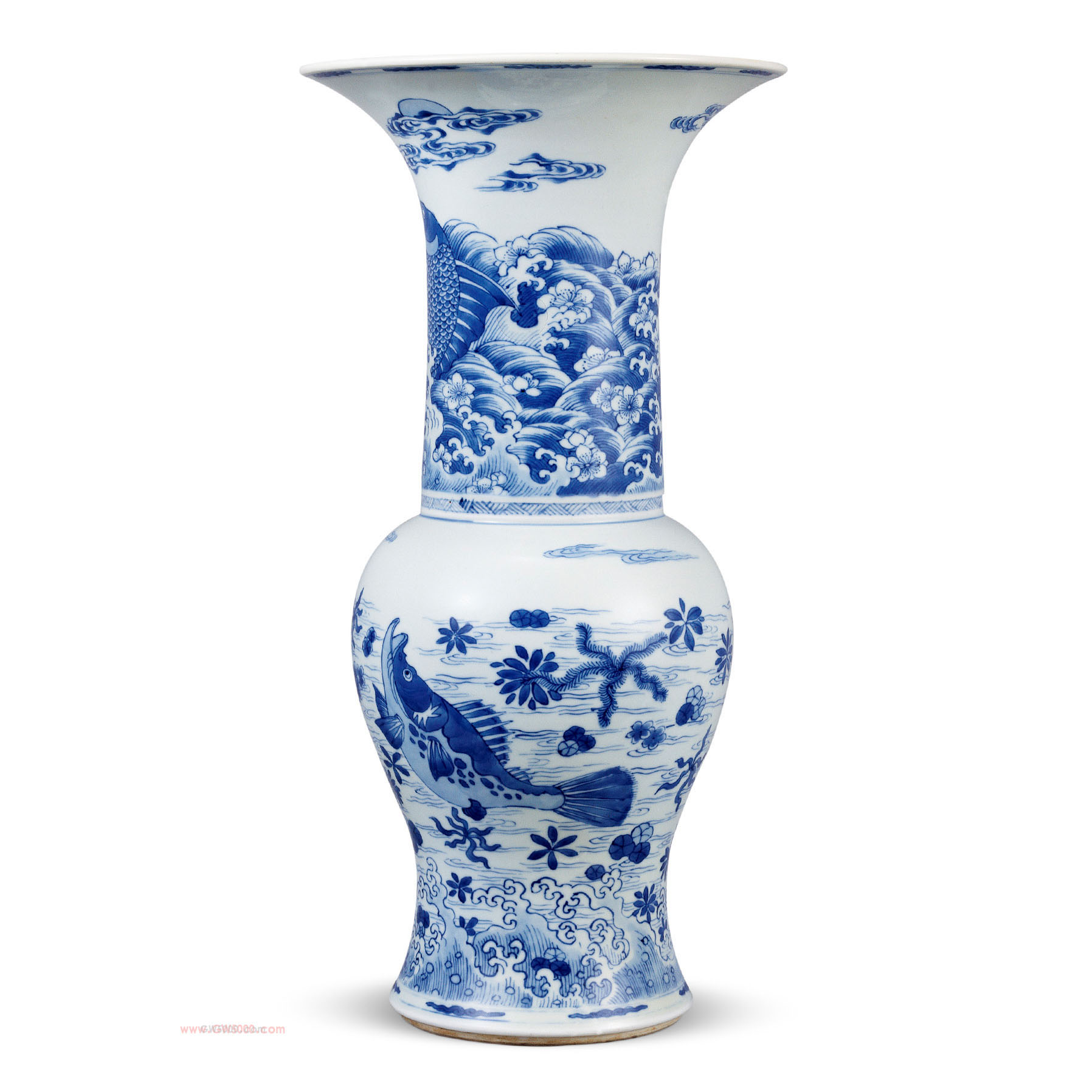 大敞口,长颈,溜肩,肩以下渐收,浅挖两层台底。通体绘海水 鱼藻纹,以夸张手法凸显鱼的肥硕和灵姿,画面趣味盎然。青花发色淡雅别致。底绘青花双圈款。