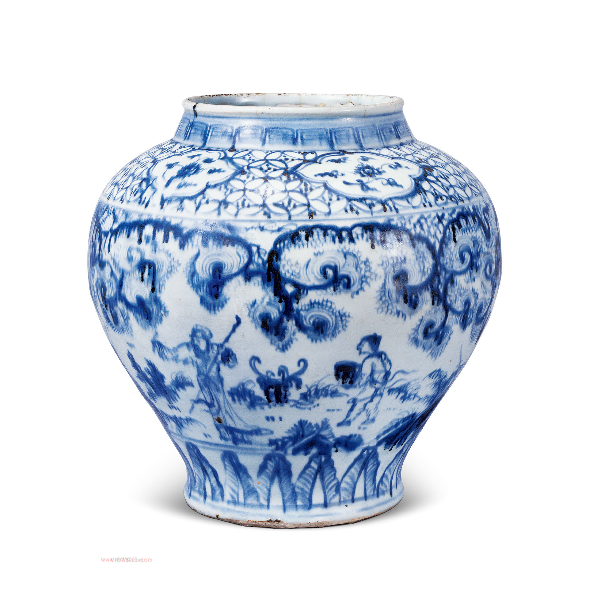 直口,圆唇,短颈,圆肩,肩下以渐收至足。通体青花纹饰,颈 部为回纹,肩部为线纹锦地海棠式开光内绘折技花卉纹,腹部主题纹饰为高士携琴访友图。近足处绘蕉叶纹。器胎体厚重,釉面肥腴,青花色泽浓重深沉,画风淋漓奔放,为明代早中期民窑的代表作品。