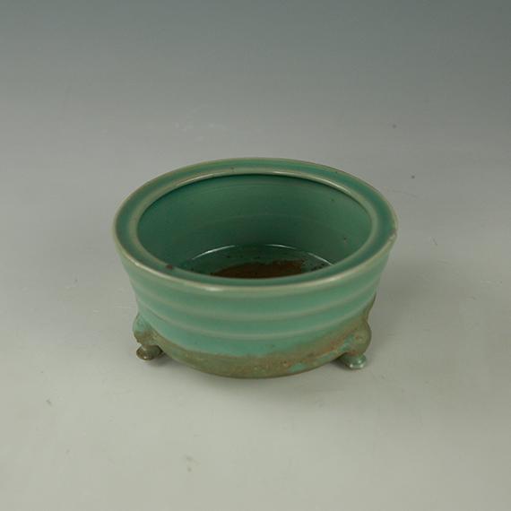 敞口,直腹,圈足,底外侧饰三兽足。外壁饰三道弦纹,通体施青釉,釉色青翠,釉层肥腴光亮,圈足着地处无釉,器内底有大片铁锈斑。