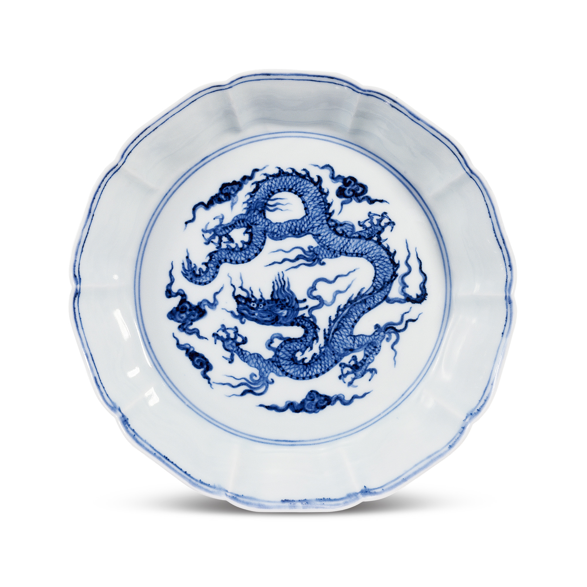 敞口,平底。器作十棱,内底绘一五爪云龙,外壁菱形十开光 绘云龙一周,两两对称。青花发色浓艳,是宣德官窑器之精品。底书